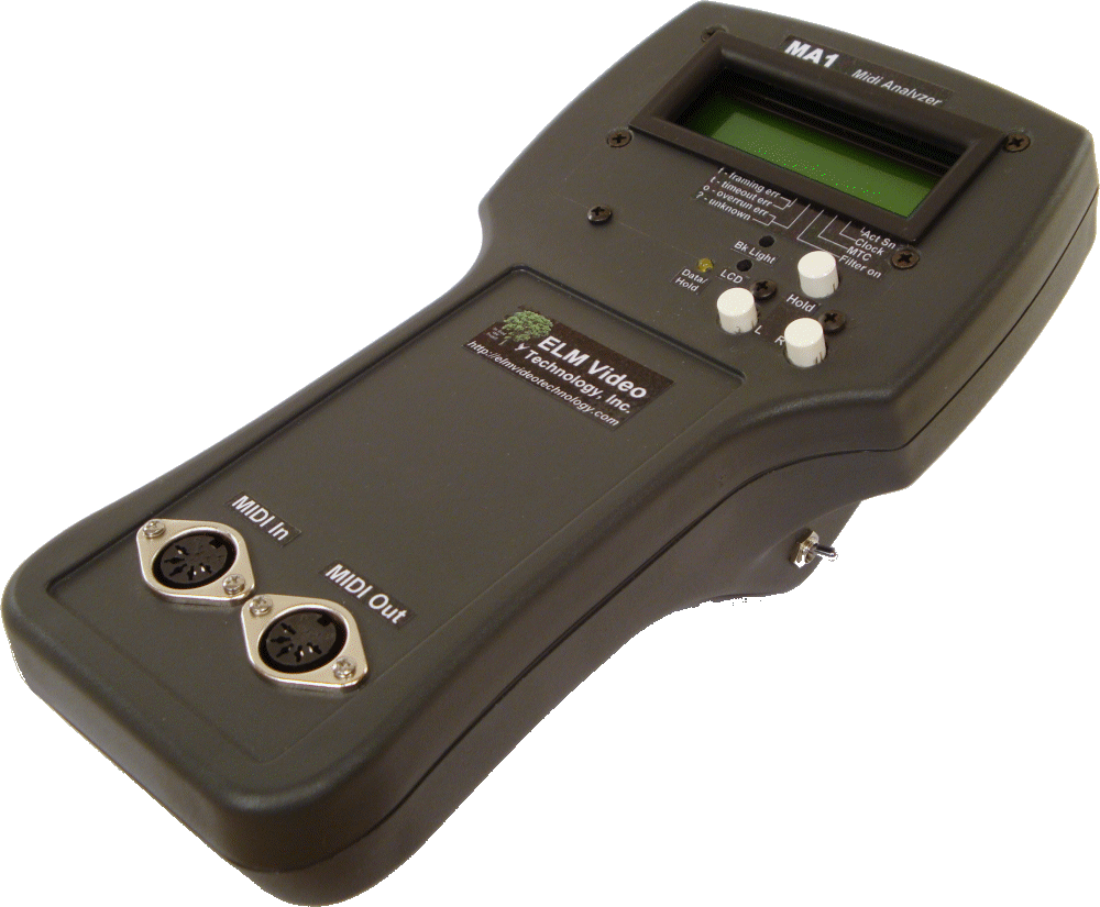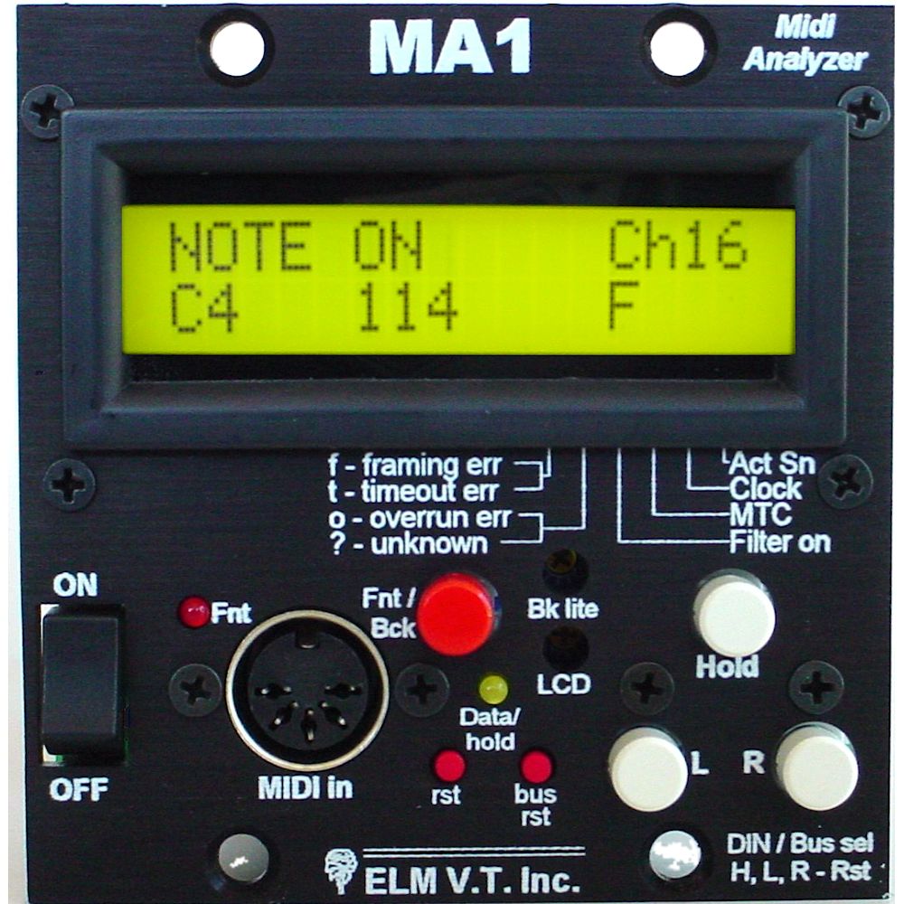 The MA1 hardware based midi message analyzer, or analyser, and will decode midi messages and display them in a user friendly format. Any message type can be filtered so that only the desired messages are displayed and stored. The MA1 has a HOLD and SCROLL feature and allows scrolling through the last several messages. Displaying Midi info and statistics such as: framing, timing and overrun errors, active sense, clock, midi time code MTC and filtered messages. Optionally has a power switch, local reset and bus reset switch, and front access LCD brightness and contrast adjustments. Available in several styles and enclosures.