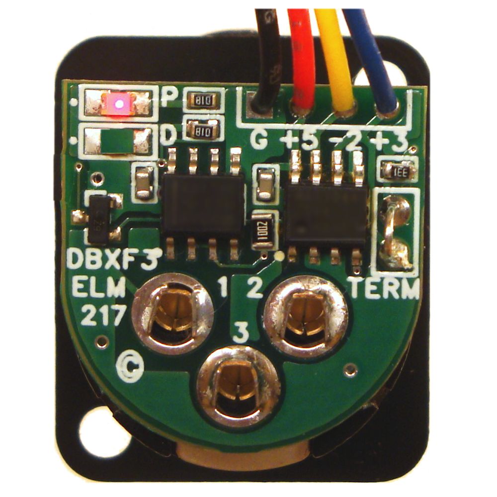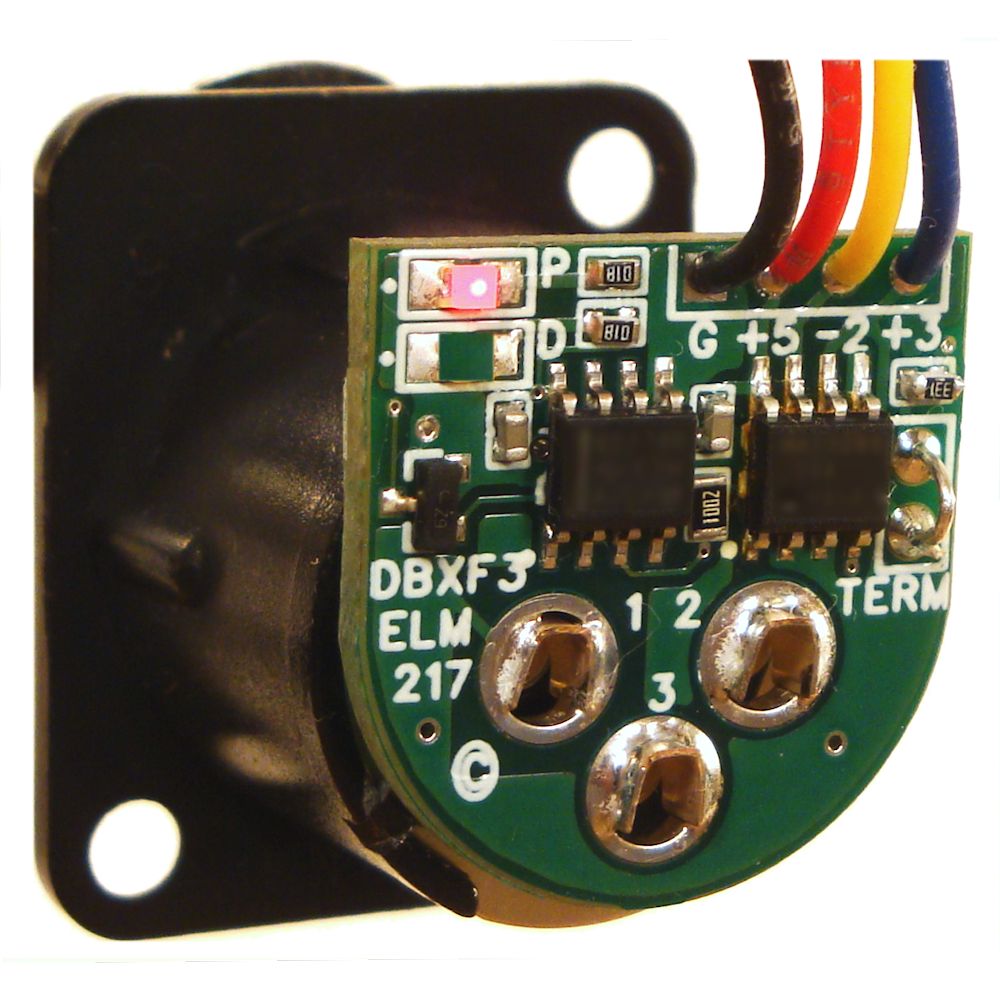 The DBXF-XLR features a red power input LED indicator and 5″ wire leads. Requires a +5V regulated power source. Ships as shown fully assembled with XLR connector, equipped with 3 pin, optional 5 pin XLR.