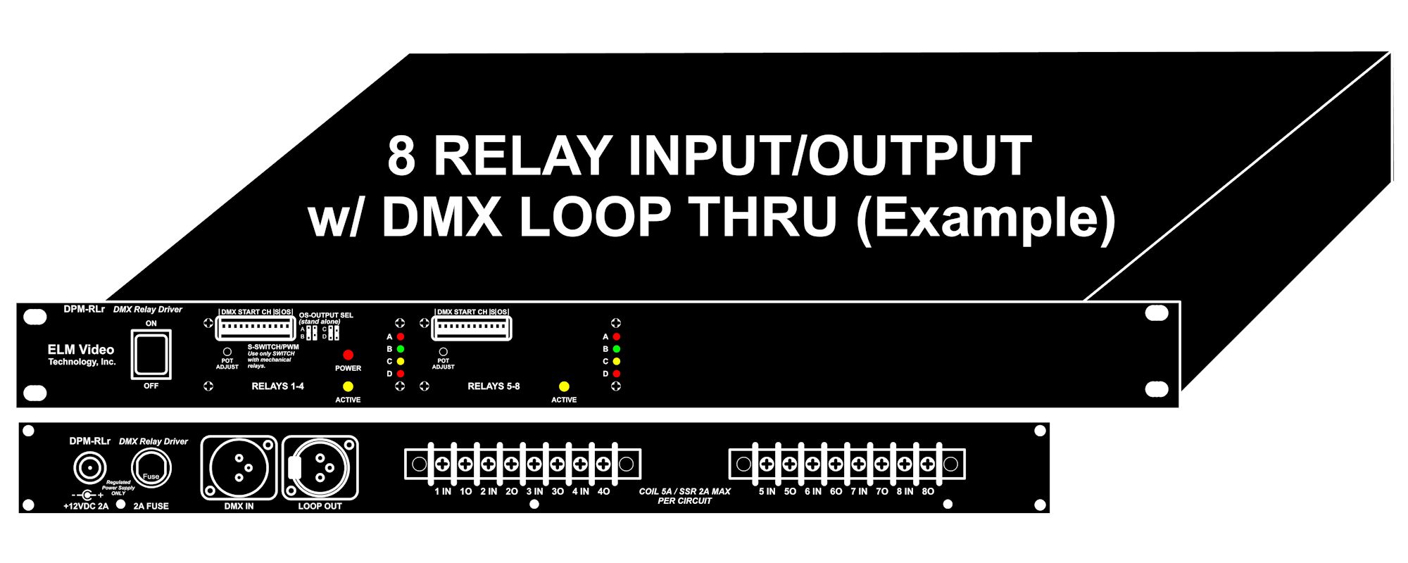 DXRLr is a DMX relay driver equipped with 8 relays in a 19″ 1RU rackmount enclosure. Each relay input/output connection is via screw terminals at 16 amps each at 120VAC. Each relay has an internal fuse. The Start Channel is assigned by dip switches 1 ~ 9. Many possibilities are available! Call or email sales for your custom configuration or design needs. External power supply included. See the DXRL Product Page for additional functional definitions and information. Note: Front power switch is an option.