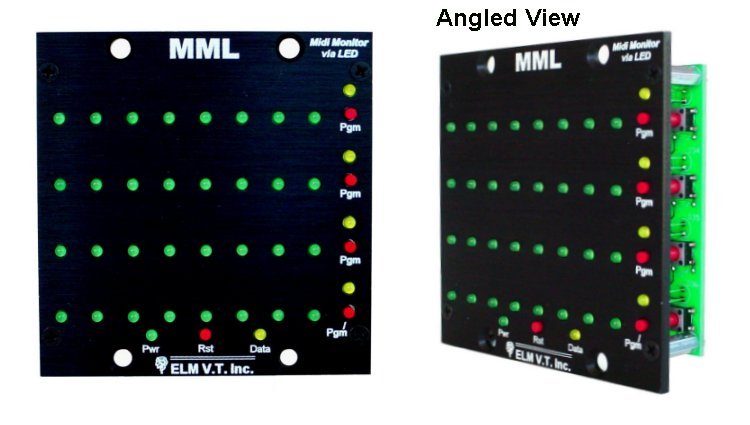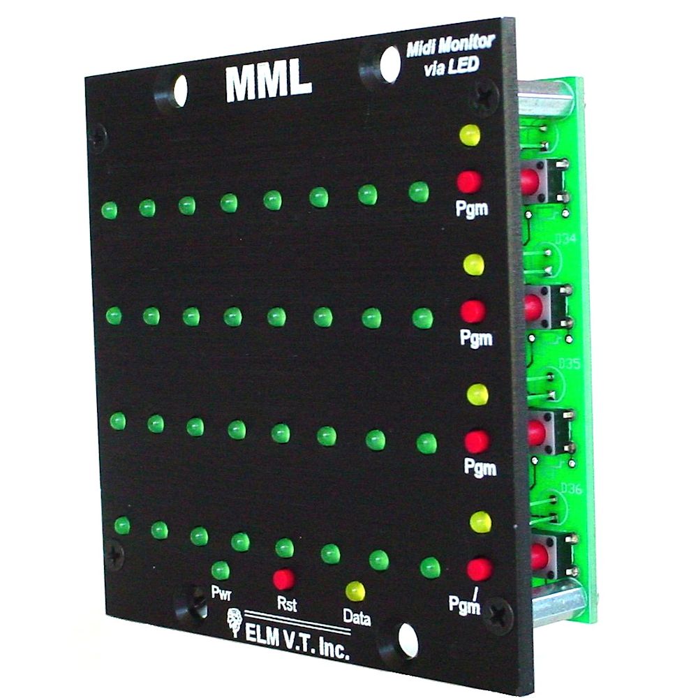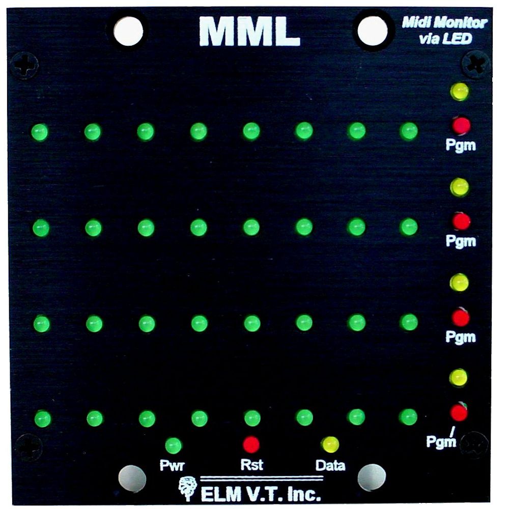 The MML module is a hardware midi message monitor that decodes midi message and displays on 32 independently programmable LED’s. Each row has a labeling area, data indicator LED, and program/test switch. The MML has a module global power and data indicator LED and reset switch. NOTE-If the chassis has only MML’s installed, one MML in the chassis needs an MML Sub board. See the MIDI LED MONITOR page for more information.